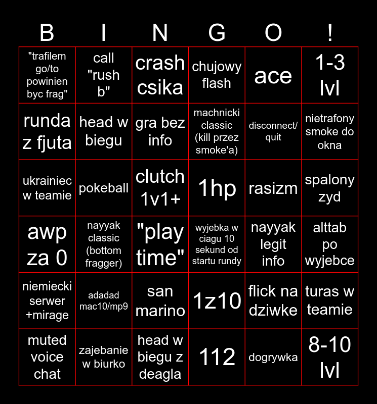 This bingo card has 36 words: 1z10, san marino, 112, runda z fjuta, awp za 0, 1hp, head w biegu, head w biegu z deagla, ace, flick na dziwke, nietrafony smoke do okna, chujowy flash, turas w teamie, pokeball, machnicki classic (kill przez smoke'a), "trafilem go/to powinien byc frag", niemiecki serwer +mirage, rasizm, ukrainiec w teamie, crash csika, clutch 1v1+, nayyak classic (bottom fragger), wyjebka w ciagu 10 sekund od startu rundy, "play time", nayyak legit info, call "rush b", disconnect/ quit, zajebanie w biurko, gra bez info, 1-3 lvl, 8-10 lvl, muted voice chat, alttab po wyjebce, spalony zyd, adadad mac10/mp9 and dogrywka.