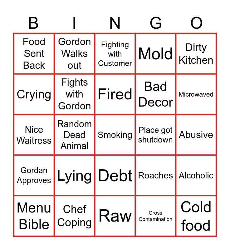 This bingo card has 25 words: Gordan Approves, Chef Coping, Smoking, Cross Contamination, Dirty Kitchen, Food Sent Back, Gordon Walks out, Fighting with Customer, Place got shutdown, Alcoholic, Crying, Fights with Gordon, Raw, Roaches, Microwaved, Menu Bible, Random Dead Animal, Fired, Bad Decor, Abusive, Nice Waitress, Lying, Debt, Mold and Cold food.