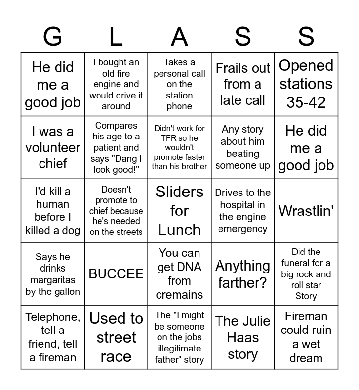 This bingo card has a free space and 24 words: BUCCEE, Used to street race, Didn't work for TFR so he wouldn't promote faster than his brother, Telephone, tell a friend, tell a fireman, Opened stations 35-42, He did me a good job, I was a volunteer chief, I bought an old fire engine and would drive it around, Drives to the hospital in the engine emergency, You can get DNA from cremains, Any story about him beating someone up, I'd kill a human before I killed a dog, Anything farther?, Did the funeral for a big rock and roll star Story, Compares his age to a patient and says "Dang I look good!", The Julie Haas story, Wrastlin', Takes a personal call on the station phone, He did me a good job, Doesn't promote to chief because he's needed on the streets, Fireman could ruin a wet dream, Says he drinks margaritas by the gallon, Frails out from a late call and The "I might be someone on the jobs illegitimate father" story.