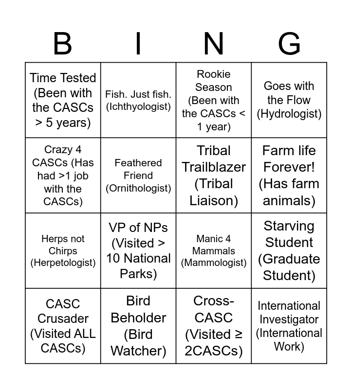 This bingo card has 30 words: ORISE Rising (ORISE Participant), Science CAPtain (CAP Fellow), Starving Student (Graduate Student), School Survivor (Recent graduate < 1 year), Time Tested (Been with the CASCs > 5 years), Rookie Season (Been with the CASCs < 1 year), Tribal Trailblazer (Tribal Liaison), RISCC-y Business (Works with Invasive Species), Bird Beholder (Bird Watcher), Mind on our money... and travel! (Admin Staff), Cross-CASC (Visited ≥ 2CASCs), CASC Crusader (Visited ALL CASCs), Petless and Proud (Does NOT Own a Pet), Livin’ off the Land (Hunter / Forager / Fisher), VP of NPs (Visited > 10 National Parks), 1,2,3, Si, Oui! (Speaks ≥ 2 Languages), Global Citizen (Lived in ≥ 2 Countries), International Investigator (International Work), Wanders with Waders (Aquatic Field Work), Crazy 4 CASCs (Has had >1 job with the CASCs), Manic 4 Mammals (Mammologist), Recovering Climatologist, Fish. Just fish. (Ichthyologist), Herps not Chirps (Herpetologist), Feathered Friend (Ornithologist), Goes with the Flow (Hydrologist), I drink Tea. Coffee is nasty., I’m with the Band… (In a band), Farm life Forever! (Has farm animals) and Computer Nerd (programmer / hardware expert).