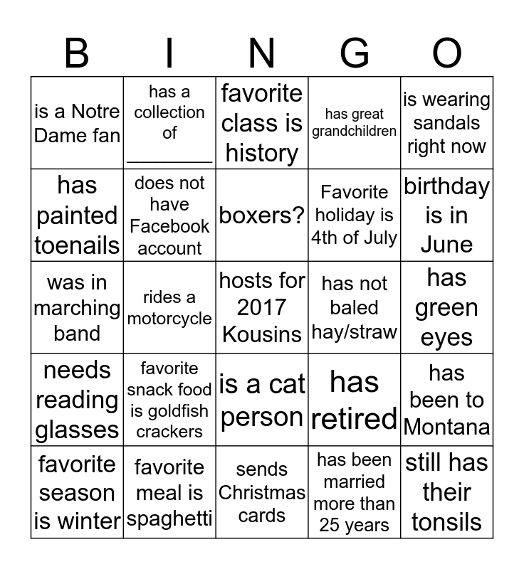 This bingo card has a free space and 24 words: favorite snack food is goldfish crackers, favorite meal is spaghetti, boxers?, favorite season is winter, is wearing sandals right now, is a Notre Dame fan, has painted toenails, has a collection of _________, has not baled hay/straw, is a cat person, Favorite holiday is 4th of July, was in marching band, has retired, has been to Montana, does not have Facebook account, has been married more than 25 years, has green eyes, favorite class is history, birthday is in June, rides a motorcycle, still has their tonsils, needs reading glasses, has great grandchildren and sends Christmas cards.