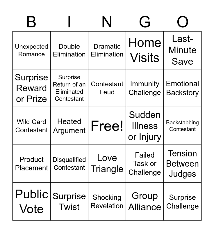This bingo card has a free space and 30 words: Surprise Twist, Tearful Goodbye, Heated Argument, Celebrity Guest Appearance, Unexpected Romance, Dramatic Elimination, Surprise Return of an Eliminated Contestant, Love Triangle, Sudden Illness or Injury, Shocking Revelation, Backstabbing Contestant, Surprise Challenge, Group Alliance, Hidden Strategy or Secret Game Plan, Emotional Backstory, Unlikely Friendship, Failed Task or Challenge, Product Placement, Disqualified Contestant, Last-Minute Save, Wild Card Contestant, Contestant Makeover, Double Elimination, Immunity Challenge, Surprise Reward or Prize, Home Visits, Tension Between Judges, Public Vote, Contestant Feud and Inspirational Story Arc.