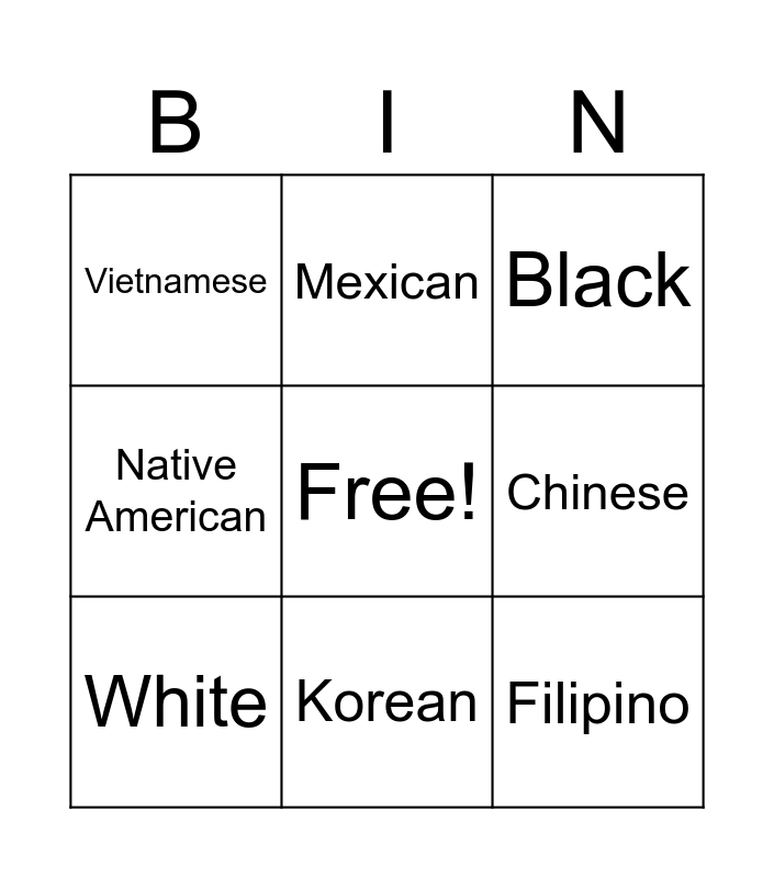 This bingo card has a free space and 8 words: Chinese, Black, Mexican, White, Vietnamese, Filipino, Native American and Korean.