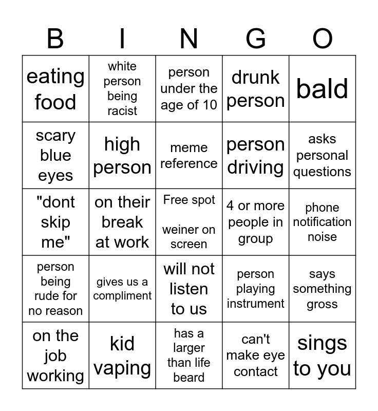 This bingo card has a free space and 24 words: gives us a compliment, kid vaping, meme reference, on the job working, bald, eating food, scary blue eyes, white person being racist, 4 or more people in group, will not listen to us, person driving, "dont skip me", person playing instrument, says something gross, high person, can't make eye contact, phone notification noise, person under the age of 10, asks personal questions, on their break at work, sings to you, person being rude for no reason, drunk person and has a larger than life beard.