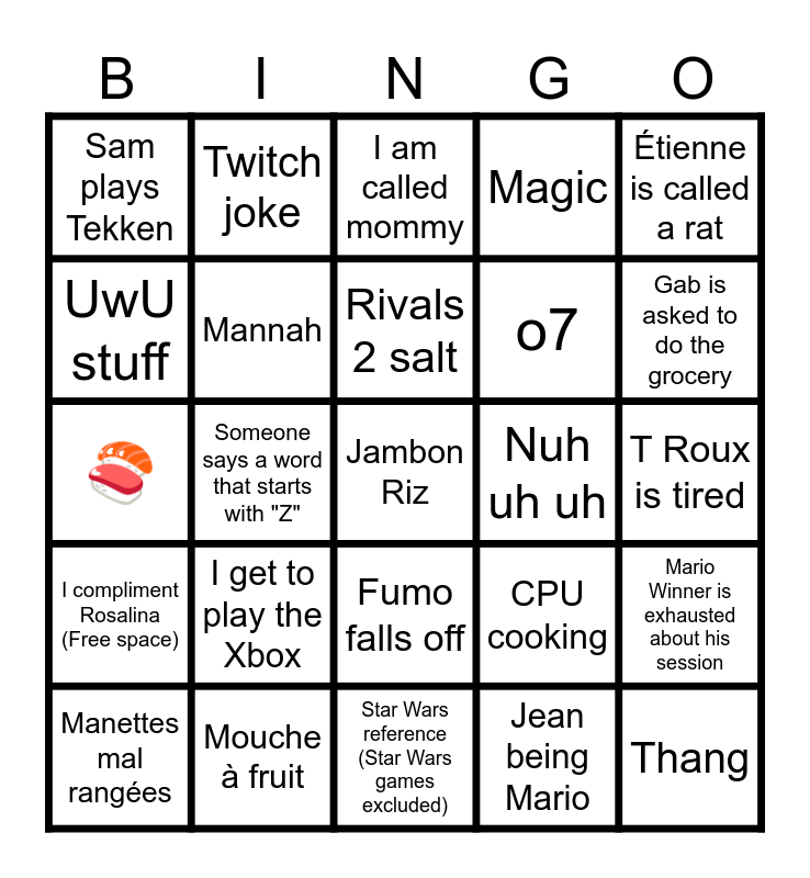 This bingo card has a free space and 24 words: Manettes mal rangées, I get to play the Xbox, Rivals 2 salt, Jean being Mario, Étienne is called a rat, Sam plays Tekken, Twitch joke, I am called mommy, Nuh uh uh, T Roux is tired, 🍣, Mannah, CPU cooking, Mario Winner is exhausted about his session, UwU stuff, Mouche à fruit, Star Wars reference (Star Wars games excluded), Magic, Gab is asked to do the grocery, I compliment Rosalina (Free space), Someone says a word that starts with "Z", Fumo falls off, o7 and Thang.