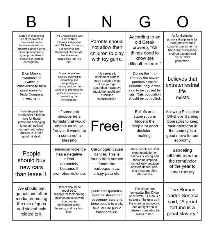 This bingo card has 15 images, a free space and 24 words: Television violence has a negative effect on society because it promotes violence., Drivers should be required to reapply for their driving licenses because with age comes diminished vision, hearing, and reaction time., It is useless to implement curfew hours because most of the younger generation nowadays should be taught self-discipline independently., We should ban games and other media promoting the use of guns and violent acts related to it., As for discipline, positive discipline is far more effective than corporal punishment or traditional disciplinary method experienced by the older generation., Meta’s (Facebook’s) use of metaverse in their social media business should not promoted since it gives more opportunities or higher possibilities to creators of internet pornography., Elon Musk’s ownership of Twitter is considered to be a great move for Tesla Company investment., The Chicago Bulls won a lot of NBA Championship titles with Michael Jordan so it is better to sign Basketball players who has the same capabilities just like him., Beliefs and superstitions hinders the people of good decision-making., Carcinogen cause cancer. This is found from burned foods like barbeque,isaw, crispy pata etc., During the 14th Century the severe pandemic called Bubonic Plague was said to be caused by rats. Rats population should be controlled., From the past few years most Filipinos vote for those politicians belonging to certain political dynasty and ruling families. It is not a good mindset., Many people feel that experimentation on animals is wrong and should be stopped immediately because animals do feel pain, and there are other alternatives., canceling all field trips for the remainder of the year to save money, Some people are actively involved in promoting and supporting a cause, such as the release of international political prisoners or protecting the environment., The singer and songwriter Bob Dylan once wrote, “A man is a success if he gets up in the morning and gets to bed at night and in between does what he wants to do.”, Allowing Philippine Off-shore Gaming Operators to keep their operation in the country is a good move for our economy, Parents should not allow their children to play with toy guns., believes that extraterrestrial life exists, If someone discovered a formula that would enable us to live forever, it would be a curse not a blessing, The Roman leader Seneca said, “A great fortune is a great slavery.”, People should buy new cars than lease it., According to an old Greek proverb, “All things good to know are difficult to learn.” and public transportation systems should ban passenger cars and force people to walk, bike, or use public transportation..