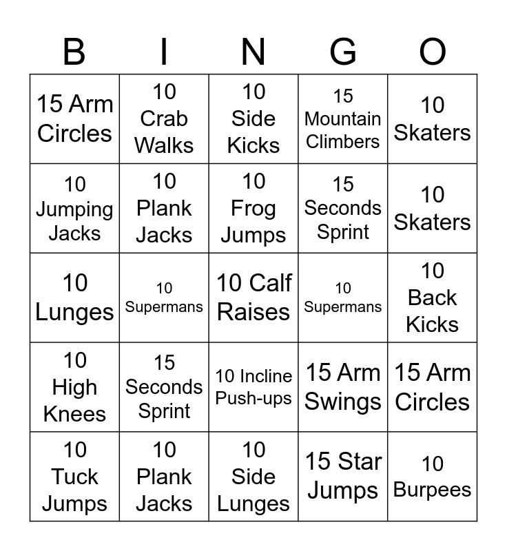 This bingo card has 54 words: 10 Push-ups, 10 High Knees, 15 Star Jumps, 10 Front Kicks, 10 Incline Push-ups, 10 Squats, 15 Mountain Climbers, 10 Side Kicks, 10 Jumping Jacks, 10 Lunges, 15 Arm Circles, 10 Burpees, 10 Plank Jacks, 10 Tuck Jumps, 10 Sit-ups, 10 Side Lunges, 10 Calf Raises, 15 Seconds Sprint, 10 Shoulder Taps, 10 Back Kicks, 15 Arm Swings, 10 Frog Jumps, 10 Supermans, 10 Skaters, 10 Bear Crawls, 10 Crab Walks, 10 Jump Squats, 10 Push-ups, 10 High Knees, 15 Star Jumps, 10 Front Kicks, 10 Incline Push-ups, 10 Squats, 15 Mountain Climbers, 10 Side Kicks, 10 Jumping Jacks, 10 Lunges, 15 Arm Circles, 10 Burpees, 10 Plank Jacks, 10 Tuck Jumps, 10 Sit-ups, 10 Side Lunges, 10 Calf Raises, 15 Seconds Sprint, 10 Shoulder Taps, 10 Back Kicks, 15 Arm Swings, 10 Frog Jumps, 10 Supermans, 10 Skaters, 10 Bear Crawls, 10 Crab Walks and 10 Jump Squats.