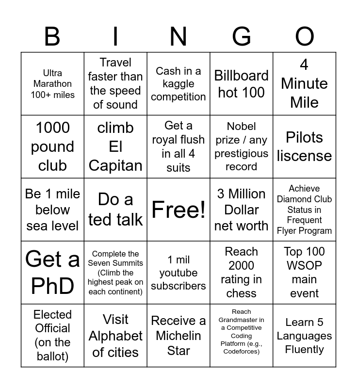 This bingo card has a free space and 24 words: Complete the Seven Summits (Climb the highest peak on each continent), Visit Alphabet of cities, Get a royal flush in all 4 suits, Elected Official (on the ballot), 4 Minute Mile, Ultra Marathon 100+ miles, 1000 pound club, Travel faster than the speed of sound, 3 Million Dollar net worth, 1 mil youtube subscribers, Nobel prize / any prestigious record, Be 1 mile below sea level, Reach 2000 rating in chess, Top 100 WSOP main event, climb El Capitan, Reach Grandmaster in a Competitive Coding Platform (e.g., Codeforces), Achieve Diamond Club Status in Frequent Flyer Program, Cash in a kaggle competition, Pilots liscense, Do a ted talk, Learn 5 Languages Fluently, Get a PhD, Billboard hot 100 and Receive a Michelin Star.