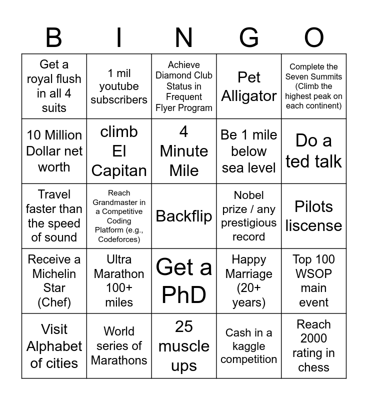 This bingo card has a free space and 24 words: Ultra Marathon 100+ miles, World series of Marathons, 4 Minute Mile, Visit Alphabet of cities, Complete the Seven Summits (Climb the highest peak on each continent), Get a royal flush in all 4 suits, 10 Million Dollar net worth, 1 mil youtube subscribers, Nobel prize / any prestigious record, Get a PhD, Be 1 mile below sea level, Travel faster than the speed of sound, Happy Marriage (20+ years), Top 100 WSOP main event, climb El Capitan, Cash in a kaggle competition, Pilots liscense, Achieve Diamond Club Status in Frequent Flyer Program, Do a ted talk, Reach Grandmaster in a Competitive Coding Platform (e.g., Codeforces), Reach 2000 rating in chess, Receive a Michelin Star (Chef), Pet Alligator and 25 muscle ups.