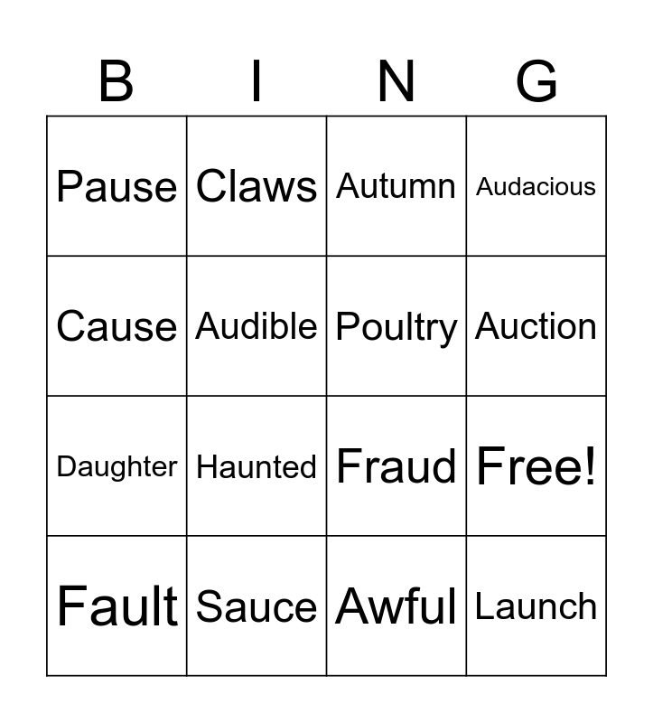 This bingo card has 20 words: Free!, Author, Autumn, August, Fault, Cause, Sauce, Pause, Daughter, Claws, Haunted, Fraud, Audible, Launch, Poultry, Auditory, Auction, Audacious, Awful and Australia.