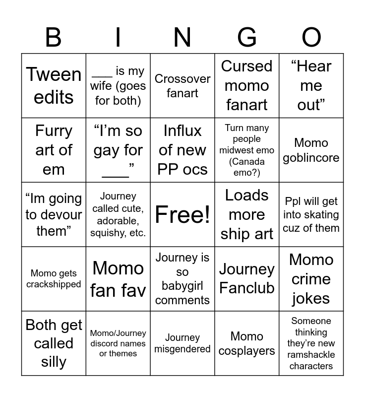 This bingo card has a free space and 24 words: Momo fan fav, Momo/Journey discord names or themes, Influx of new PP ocs, Both get called silly, “Hear me out”, Tween edits, Furry art of em, ___ is my wife (goes for both), Loads more ship art, Journey is so babygirl comments, Turn many people midwest emo (Canada emo?), “Im going to devour them”, Journey Fanclub, Momo crime jokes, “I’m so gay for ___”, Momo cosplayers, Ppl will get into skating cuz of them, Crossover fanart, Momo goblincore, Journey called cute, adorable, squishy, etc., Someone thinking they’re new ramshackle characters, Momo gets crackshipped, Cursed momo fanart and Journey misgendered.