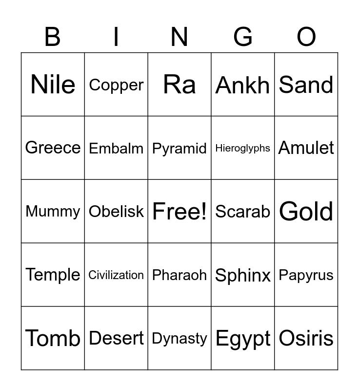 This bingo card has a free space and 26 words: Pharaoh, Egypt, Pyramid, Desert, Sand, Nile, Greece, Copper, Gold, Sphinx, Hieroglyphs, Mummy, Papyrus, Tomb, Obelisk, Sarcophagus, Ankh, Temple, Ra, Osiris, Amulet, Dynasty, Scarab, Civilization, Embalm and Canopic jars.