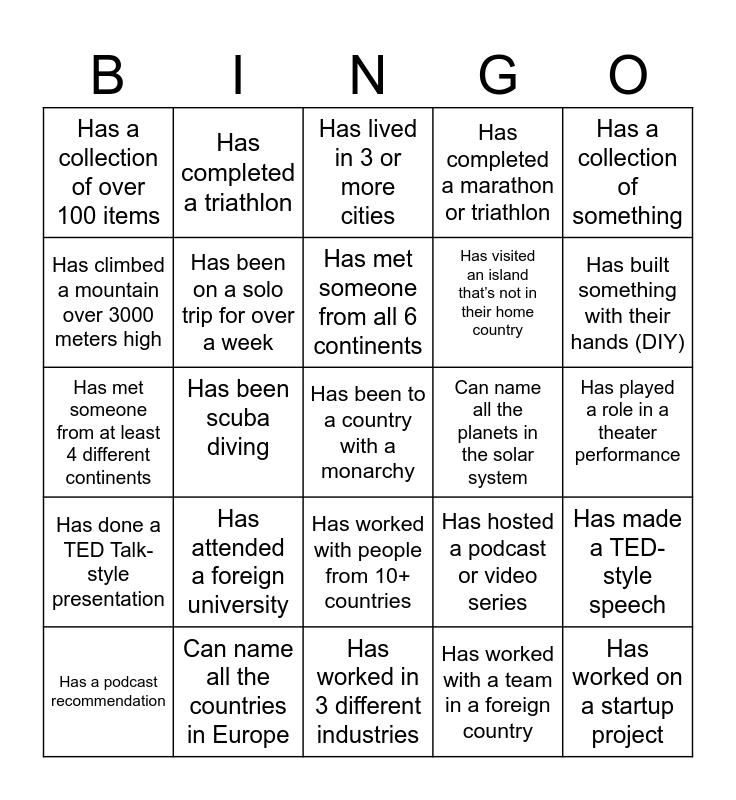 This bingo card has a free space and 34 words: Has written a book or article, Has worked with a team in a foreign country, Has made a major career switch, Has been on TV or radio, Has done a TED Talk-style presentation, Has been on a solo trip for over a week, Has a collection of something, Has a podcast recommendation, Has completed a triathlon, Has visited 10+ countries, Has met someone from all 6 continents, Has lived in 3 or more cities, Has done volunteer work abroad, Can speak a language with 10+ letters, Can name all the planets in the solar system, Has built something with their hands (DIY), Can name all the countries in Europe, Has met someone from at least 4 different continents, Has attended a foreign university, Has hosted a podcast or video series, Has worked with people from 10+ countries, Has volunteered in a crisis situation, Has a collection of over 100 items, Has played a role in a theater performance, Has worked in 3 different industries, Has worked on a startup project, Has completed a marathon or triathlon, Has published a scientific paper, Has visited an island that’s not in their home country, Has climbed a mountain over 3000 meters high, Has volunteered at a major international event, Has been scuba diving, Has made a TED-style speech and Has attended a foreign university.