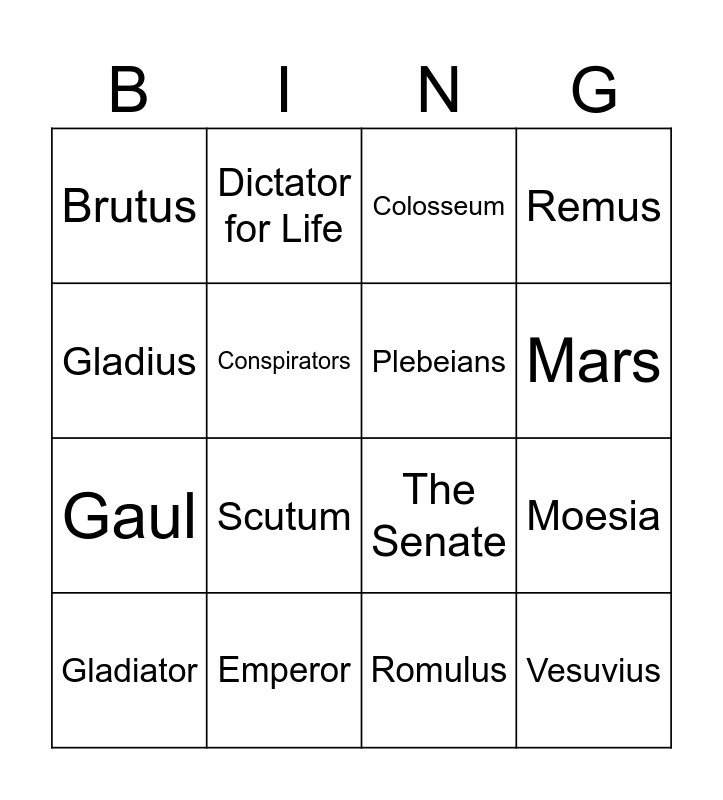 This bingo card has 20 words: Moesia, Lanista, Colosseum, Priscus, Gladiator, Gladius, Emperor, Brutus, Gaul, Dictator for Life, Scutum, The Senate, Conspirators, Vesuvius, Plebeians, Iceni, Mars, Remus, Romulus and Hadrian.
