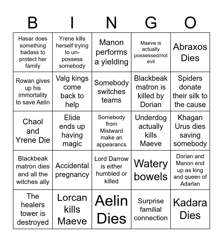 This bingo card has 25 words: Accidental pregnancy, Aelin Dies, Somebody switches teams, The healers tower is destroyed, Abraxos Dies, Hasar does something badass to protect her family, Rowan gives up his immortality to save Aelin, Yrene kills herself trying to un-possess somebody, Underdog actually kills Maeve, Lord Darrow is either humbled or killed, Blackbeak matron is killed by Dorian, Chaol and Yrene Die, Watery bowels, Dorian and Manon end up as king and queen of Adarlan, Valg kings come back to help, Kadara Dies, Khagan Urus dies saving somebody, Manon performs a yielding, Spiders donate their silk to the cause, Elide ends up having magic, Somebody from Mistward make an appearancs, Lorcan kills Maeve, Blackbeak matron dies and all the witches ally, Maeve is actually possessed/not evil and Surprise familial connection.