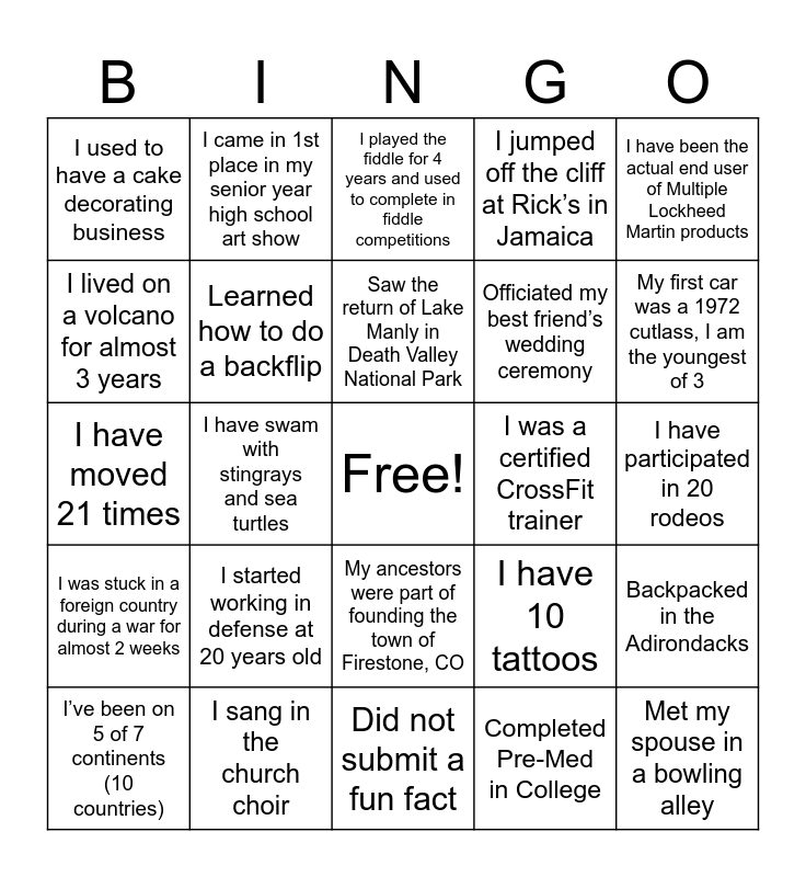 This bingo card has a free space and 24 words: I started working in defense at 20 years old, I sang in the church choir, Saw the return of Lake Manly in Death Valley National Park, I’ve been on 5 of 7 continents (10 countries), I have been the actual end user of Multiple Lockheed Martin products, I used to have a cake decorating business, I lived on a volcano for almost 3 years, I came in 1st place in my senior year high school art show, I was a certified CrossFit trainer, My ancestors were part of founding the town of Firestone, CO, Officiated my best friend’s wedding ceremony, I have moved 21 times, I have 10 tattoos, Backpacked in the Adirondacks, Learned how to do a backflip, Completed Pre-Med in College, I have participated in 20 rodeos, I played the fiddle for 4 years and used to complete in fiddle competitions, My first car was a 1972 cutlass, I am the youngest of 3, I have swam with stingrays and sea turtles, Met my spouse in a bowling alley, I was stuck in a foreign country during a war for almost 2 weeks, I jumped off the cliff at Rick’s in Jamaica and Did not submit a fun fact.