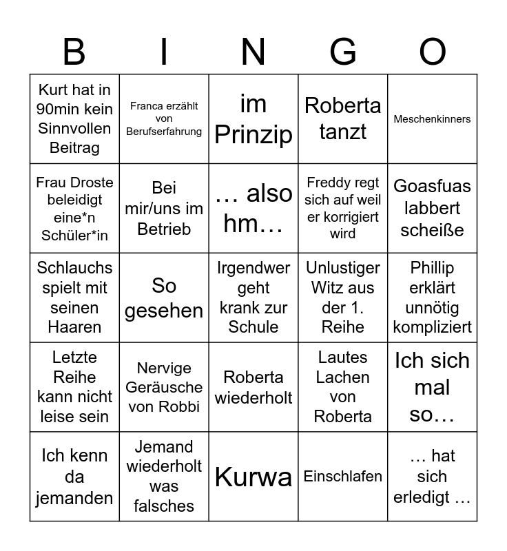 This bingo card has 27 words: Lautes Lachen von Roberta, … hat sich erledigt …, Freddy regt sich auf weil er korrigiert wird, Kurwa, Frau Droste beleidigt eine*n Schüler*in, im Prinzip, Franca erzählt von Berufserfahrung, Letzte Reihe kann nicht leise sein, Unlustiger Witz aus der 1. Reihe, Ich sich mal so…, Schlauchs spielt mit seinen Haaren, Roberta tanzt, Ich kenn da jemanden, Jemand wiederholt was falsches, Goasfuas labbert scheiße, Im Grunde genommen, Bei mir/uns im Betrieb, … also hm…, Nervige Geräusche von Robbi, Kurt hat in 90min kein Sinnvollen Beitrag, Phillip erklärt unnötig kompliziert, Einschlafen, So gesehen, Irgendwer geht krank zur Schule, Roberta wiederholt, Meschenkinners and Anton sagt etwas selbstgefälliges.