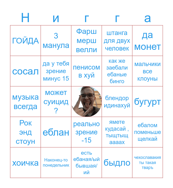 This bingo card has a free space and 24 words: еблан, Наконец-то понедельник, пенисом в хуй, хоичка, да монет, ГОЙДА, сосал, 3 манула, блендор идинахуй, реально зрение -15, как же заебали ебаные бинго, музыка всегда, ямете кудасай , тыщтыщ аааах, ебалом поменьше щелкай, да у тебя зрение минус 15, быдло, бугурт, Фарш мерш велли, мальчики все клоуны, может суицид ?, чехославакия ты такая тваръ, Рок энд стоун, штанга для двух человек and есть ебаная/ый бывшая/ий.