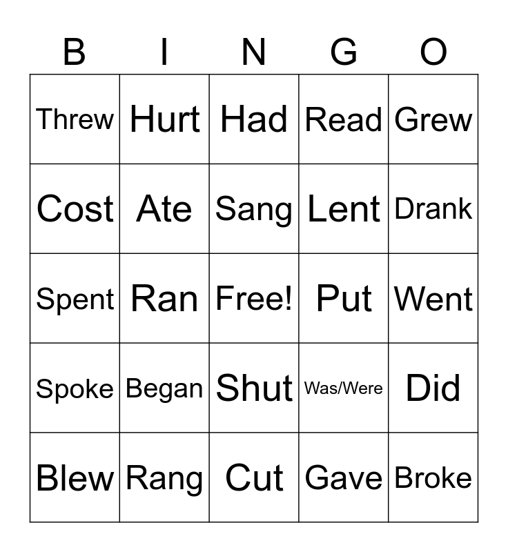 This bingo card has a free space and 24 words: Began, Rang, Sang, Blew, Grew, Threw, Cost, Hurt, Put, Shut, Lent, Spent, Was/Were, Did, Ate, Gave, Went, Had, Drank, Ran, Broke, Spoke, Read and Cut.