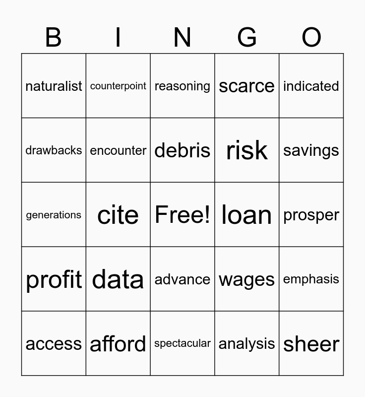 This bingo card has a free space and 24 words: data, afford, debris, access, indicated, naturalist, drawbacks, counterpoint, loan, advance, risk, generations, wages, emphasis, encounter, analysis, prosper, reasoning, savings, cite, sheer, profit, scarce and spectacular.