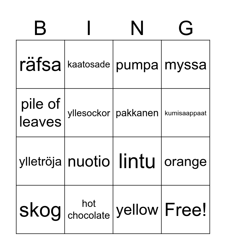 This bingo card has 23 words: Free!, höstfärger, kumisaappaat, umbrella, pile of leaves, räfsa, yllesockor, kaatosade, skog, huivi, nuotio, ylletröja, kynttilä, Thanksgiving, hot chocolate, champignon, pumpa, lintu, pakkanen, orange, myssa, yellow and mittens.