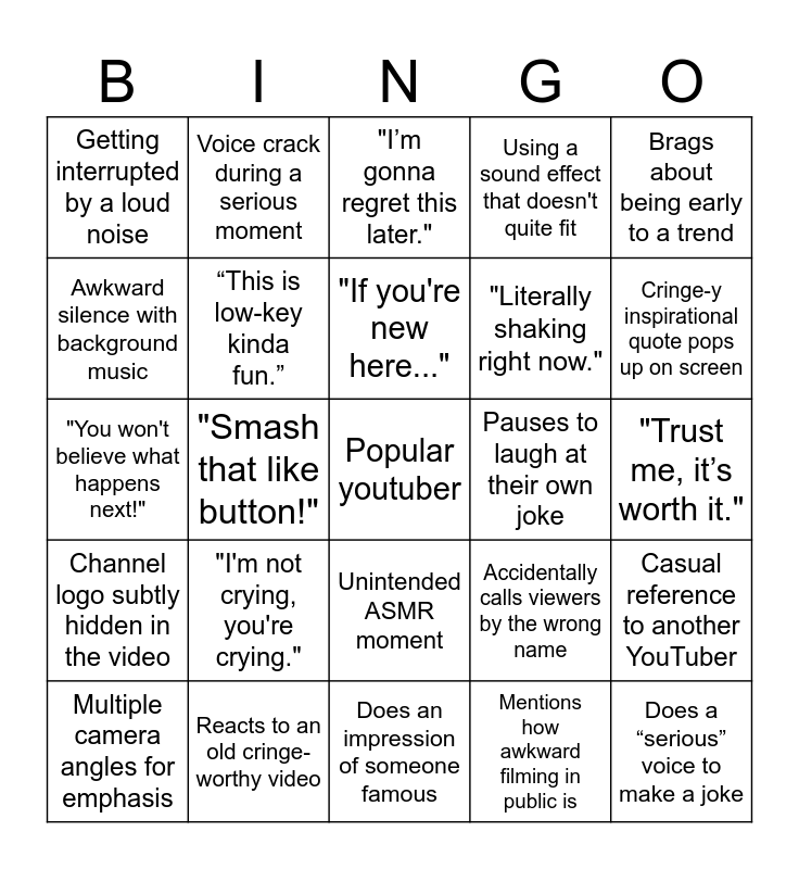 This bingo card has a free space and 157 words: "Don't forget to like and subscribe!", "Okay, let's jump right into it.", Overly dramatic thumbnail face, Random fact no one asked for, "Shout out to our sponsor!", Technical difficulty/mic glitch, "Roll the intro!", Fan Q&A or reading comments section, "Let me know in the comments!", Pet or plushie makes a guest appearance, "This is NOT a drill!", Montage with upbeat music, "You won't believe what happens next!", Unexpected jump scare or loud sound effect, Awkward silence with background music, "If you're new here...", Clickbait-y title explained away, Surprisingly deep life advice, Subscriber or follower count update, "Let’s do this!", Trying a viral trend/challenge, "We’re not sponsored, but…", Mention of a YouTube algorithm, Out-of-nowhere motivational speech, "I did it so you don’t have to.", Editing error spotted, "Smash that like button!", Totally staged 'candid' moment, Commenting on the number of dislikes, Messy room in the background, Unboxing something “super exclusive”, Surprise cameo from a friend or family member, "Let me break it down for you.", Last-minute changes to the video, Viewer challenge: “Comment if you made it this far!”, “This video took SO long to make.”, “Sorry for the lack of uploads!”, First take mistake or blooper left in, Casual reference to another YouTuber, "That’s it, I’m done!" (as a joke), "Wait, hear me out...", Camera shake from accidental bump, "You guys asked for this!", First-person 'day in the life' POV, Mention of an upcoming project, Accidentally calls viewers by the wrong name, "I'm running on zero sleep right now.", Obligatory 'yelling at the editor' moment, Dramatic cliffhanger pause, “Sorry about the lighting…”, "This part is my favorite.", "Trust me, it’s worth it.", Viewer polls or audience opinions requested, Custom transition animation, Quick flash of a meme, "I'm not crying, you're crying.", Exaggerated expression for comedic effect, Random flashback to older videos, "I can't believe I'm actually doing this.", Showcasing merchandise or product line, Random shoutout to a friend’s channel, Unintended ASMR moment, Multiple camera angles for emphasis, Pauses to laugh at their own joke, "Why am I like this?", Channel logo subtly hidden in the video, Unexpectedly deep or philosophical comment, "I have no idea what I’m doing.", Background music randomly becomes way louder, Reacts to an old cringe-worthy video, "You’re probably wondering how I got here…", Screen shakes to convey emotion, Getting interrupted by a loud noise, Voice crack during a serious moment, Mentions a video that never happened, "I'm just gonna wing it.", Uses a funny GIF to emphasize a reaction, "Please don’t judge me.", First-person adventure perspective, Mispronouncing something and laughing about it, "This was so hard to pull off.", Audience ‘choose what happens next’ request, Glitchy visual effect for comedic impact, Editing mistake left in on purpose, "Don’t @ me.", Holding up a product for dramatic emphasis, Mentions how awkward filming in public is, "Let’s get into it.", Showing off their workspace or setup, Misplaced timestamp appearing randomly, Nervously laughing at own joke, Easter egg hidden in the background, Using a sound effect that doesn't quite fit, Voiceover in an exaggerated accent, Unexpected “duet” with a famous clip, Casually mentions “big news” without explaining, "I’m gonna regret this later.", Talks about a past video that went viral, Cutting away from something embarrassing, Classic clickbait sigh, "Wait, scratch that…", "Here’s the tea…", Long intro with random B-roll clips, Showing their pet’s reaction to something random, Sudden “spooky” vibe for dramatic effect, Breaks out into random dance, Admits they forgot to record something, "Literally shaking right now.", Makes fun of their own thumbnail, "I hope my parents don’t see this.", Unexpectedly emotional moment, Makes an awkward or sarcastic face, Mentions they almost scrapped this video, Sings off-key for humor, Intentionally blurs out an embarrassing part, Puts on a funny hat or costume mid-video, Mentions “the algorithm” as a joke, Random blooper plays mid-sentence, "This might be my last video…" (jokingly), Mentions their “true fans” or OG viewers, Makes fun of a trend that went too far, “This is low-key kinda fun.”, Pretends to be shocked at something they know, Mentions a viral TikTok trend, Does a “serious” voice to make a joke, Throws shade at other YouTubers (jokingly), Repeatedly loses train of thought, Adds random subtitles for comedic effect, Asks if they’re “too old for this”, Jumpscares themselves with their own content, Calls themselves out on a mistake, "What was I thinking?", “You’ve been asking for this one…”, Zooms in dramatically on their face, Does an impression of someone famous, Pulls out a random prop, "Let's hope I don’t mess this up.", Randomly addresses haters in the comments, Pretends to “rage quit”, Mentions how different the channel used to be, Picks up an instrument for a quick, bad solo, “This is a family-friendly channel!” (ironically), Brags about being early to a trend, Switches to black-and-white for dramatic effect, Pulls a prank on a friend or family member, Jokingly calls themselves out on bad posture, Gets overly invested in a random detail, “Not gonna lie, this is kinda scary.”, Sudden switch to a “serious” voice, Shows fan art or mail from viewers, Zooms in on something gross or cringe-worthy, Repeatedly clears their throat nervously, Does a random voiceover to fix a mistake, Breaks out in a cheesy catchphrase, “Let’s see how long it takes to regret this.”, Cringe-y inspirational quote pops up on screen and Claims something is “way harder than it looks”.