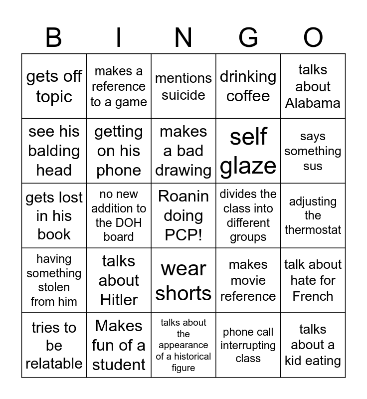 This bingo card has a free space and 24 words: talks about Hitler, Makes fun of a student, makes a bad drawing, tries to be relatable, talks about Alabama, gets off topic, see his balding head, makes a reference to a game, divides the class into different groups, wear shorts, self glaze, gets lost in his book, makes movie reference, talk about hate for French, getting on his phone, phone call interrupting class, adjusting the thermostat, mentions suicide, says something sus, no new addition to the DOH board, talks about a kid eating, having something stolen from him, drinking coffee and talks about the appearance of a historical figure.