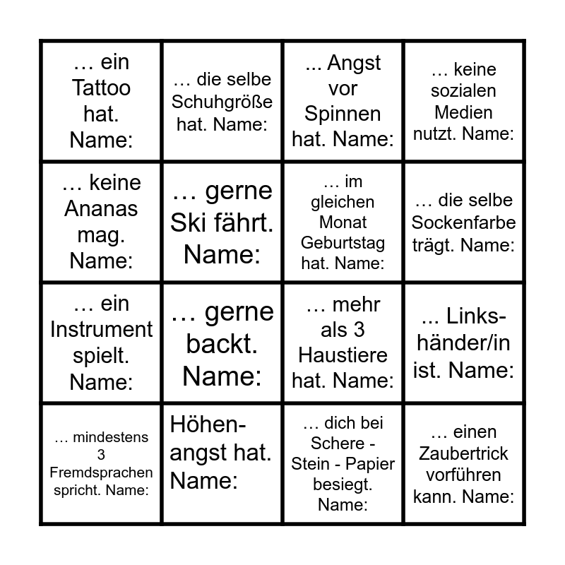 This bingo card has 16 words: Höhen-angst hat. Name:, ... Links-händer/in ist. Name:, ... Angst vor Spinnen hat. Name:, … ein Tattoo hat. Name:, … ein Instrument spielt. Name:, … die selbe Schuhgröße hat. Name:, … mehr als 3 Haustiere hat. Name:, … dich bei Schere - Stein - Papier besiegt. Name:, … keine Ananas mag. Name:, … gerne Ski fährt. Name:, … mindestens 3 Fremdsprachen spricht. Name:, … keine sozialen Medien nutzt. Name:, … gerne backt. Name:, … die selbe Sockenfarbe trägt. Name:, … im gleichen Monat Geburtstag hat. Name: and … einen Zaubertrick vorführen kann. Name:.