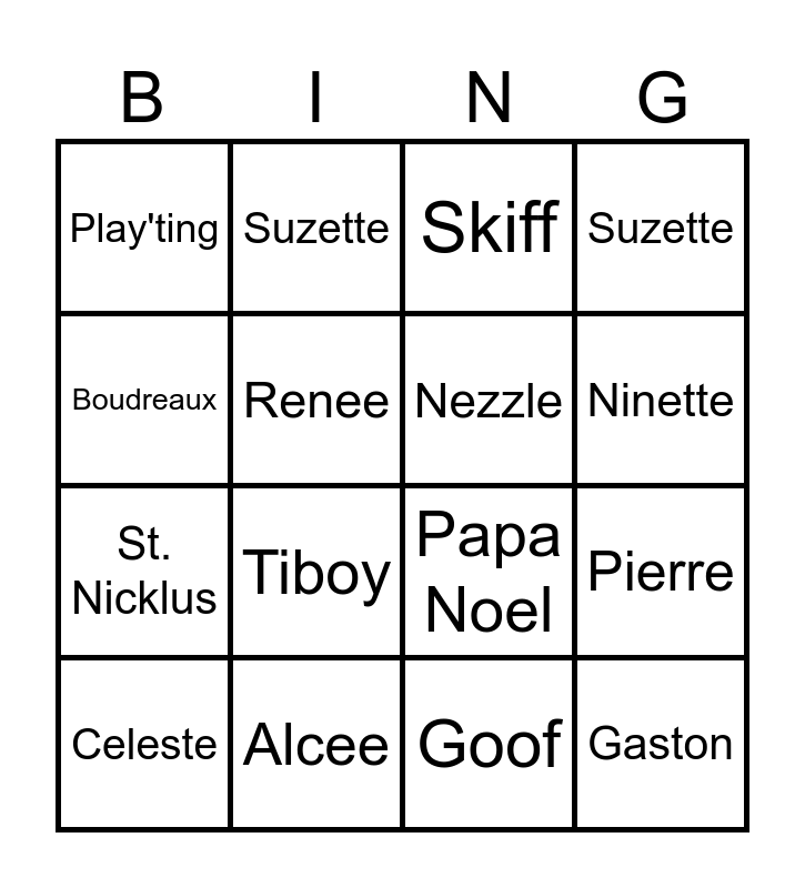 This bingo card has 19 words: Papa Noel, Musk-rat, Skiff, Gaston, Pierre, Boudreaux, Goof, Play'ting, Suzette, St. Nicklus, Tiboy, Renee, Nezzle, Alcee, Celeste, Ninette, Suzette, Ninette and Alcee.