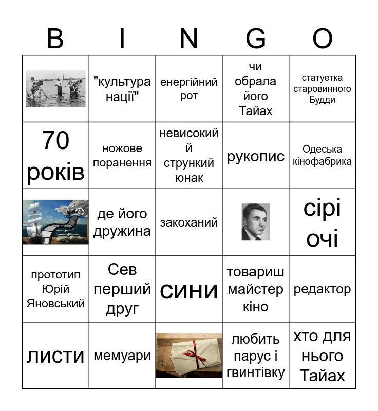 This bingo card has 4 images, a free space and 20 words: Сев перший друг, мемуари, невисокий й стрункий юнак, листи, статуетка старовинного Будди, 70 років, "культура нації", сини, рукопис, товариш майстер кіно, редактор, ножове поранення, любить парус і гвинтівку, сірі очі, енергійний рот, Одеська кінофабрика, де його дружина, хто для нього Тайах, прототип Юрій Яновський and чи обрала його Тайах.