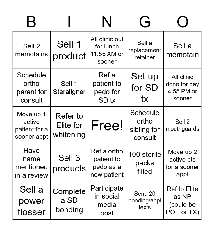 This bingo card has a free space and 24 words: Sell 3 products, Complete a SD bonding, Ref a patient to pedo for SD tx, Sell a power flosser, Sell a memotain, Sell 2 memotains, Schedule ortho parent for consult, Sell 1 product, Schedule ortho sibling for consult, Ref a ortho patient to pedo as a new patient, Set up for SD tx, Move up 1 active patient for a sooner appt, 100 sterile packs filled, Move up 2 active pts for a sooner appt, Sell 1 Steraligner, Send 20 bonding/appl texts, Sell 2 mouthguards, All clinic out for lunch 11:55 AM or sooner, All clinic done for day 4:55 PM or sooner, Refer to Elite for whitening, Ref to Elite as NP (could be POE or TX), Have name mentioned in a review, Sell a replacement retainer and Participate in social media post.