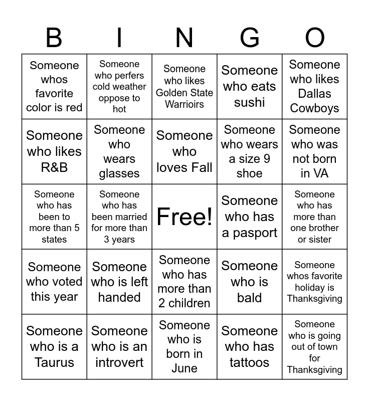 This bingo card has a free space and 24 words: Someone who is left handed, Someone who is an introvert, Someone who loves Fall, Someone who is a Taurus, Someone who likes Dallas Cowboys, Someone whos favorite color is red, Someone who likes R&B, Someone who perfers cold weather oppose to hot, Someone who has a pasport, Someone who has more than 2 children, Someone who wears a size 9 shoe, Someone who has been to more than 5 states, Someone who is bald, Someone whos favorite holiday is Thanksgiving, Someone who wears glasses, Someone who has tattoos, Someone who has more than one brother or sister, Someone who likes Golden State Warrioirs, Someone who was not born in VA, Someone who has been married for more than 3 years, Someone who is going out of town for Thanksgiving, Someone who voted this year, Someone who eats sushi and Someone who is born in June.