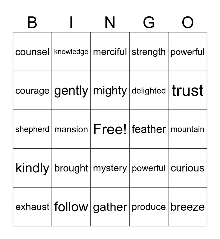 This bingo card has a free space and 29 words: exhaust, justify, mansion, credit, counsel, merciful, gently, brought, feather, follow, mountain, breeze, gather, produce, trust, wasted, mystery, kindly, powerful, shepherd, powerful, majestic, delighted, courage, strength, knowledge, curious, mighty and defeated.