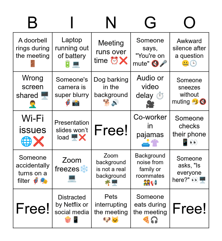 This bingo card has a free space and 24 words: Zoom freezesβοΈπ», Distracted by Netflix or social media πΏπ±, Dog barking in the background ππ, Free!, Awkward silence after a question π€π, A doorbell rings during the meeting πͺ, Wrong screen shared π₯οΈπ€¦ββοΈ, Laptop running out of battery ππ», Co-worker in pajamas ποΈπ, Zoom background is not a real background π΄π₯οΈ, Audio or video delay β±οΈπ₯, Wi-Fi issues πβ, Background noise from family or roommates π¨βπ©βπ§βπ¦π’, Someone asks, "Is everyone here?" ππ₯οΈ, Someone's camera is super blurry π¦ΈββοΈπΈ, Someone eats during the meeting ππ§, Someone checks their phone π±π, Meeting runs over time β°β, Someone sneezes without muting π€§π, Presentation slides wonβt load π₯οΈβ, Free!, Someone accidentally turns on a filter π¦ΈββοΈπ, Someone says, "You're on mute" ππ€ and Pets interrupting the meeting πΆπ±.