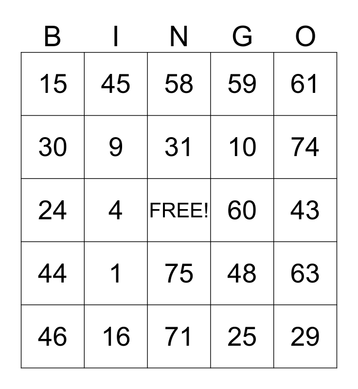 This bingo card has a free space and 24 words: 1, 16, 31, 46, 61, 15, 30, 45, 60, 75, 10, 24, 48, 63, 9, 25, 43, 58, 74, 4, 29, 44, 59 and 71.