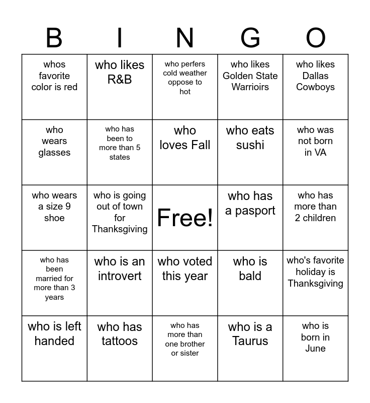 This bingo card has a free space and 24 words: who is left handed, who is an introvert, who loves Fall, who is a Taurus, who likes Dallas Cowboys, whos favorite color is red, who likes R&B, who perfers cold weather oppose to hot, who has a pasport, who has more than 2 children, who wears a size 9 shoe, who has been to more than 5 states, who is bald, who's favorite holiday is Thanksgiving, who wears glasses, who has tattoos, who has more than one brother or sister, who likes Golden State Warrioirs, who was not born in VA, who has been married for more than 3 years, who is going out of town for Thanksgiving, who voted this year, who eats sushi and who is born in June.