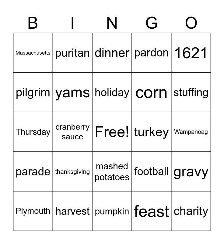 This bingo card has a free space and 24 words: thanksgiving, harvest, holiday, Plymouth, 1621, Massachusetts, pilgrim, puritan, turkey, mashed potatoes, corn, Thursday, football, gravy, yams, feast, Wampanoag, dinner, stuffing, cranberry sauce, charity, parade, pardon and pumpkin.
