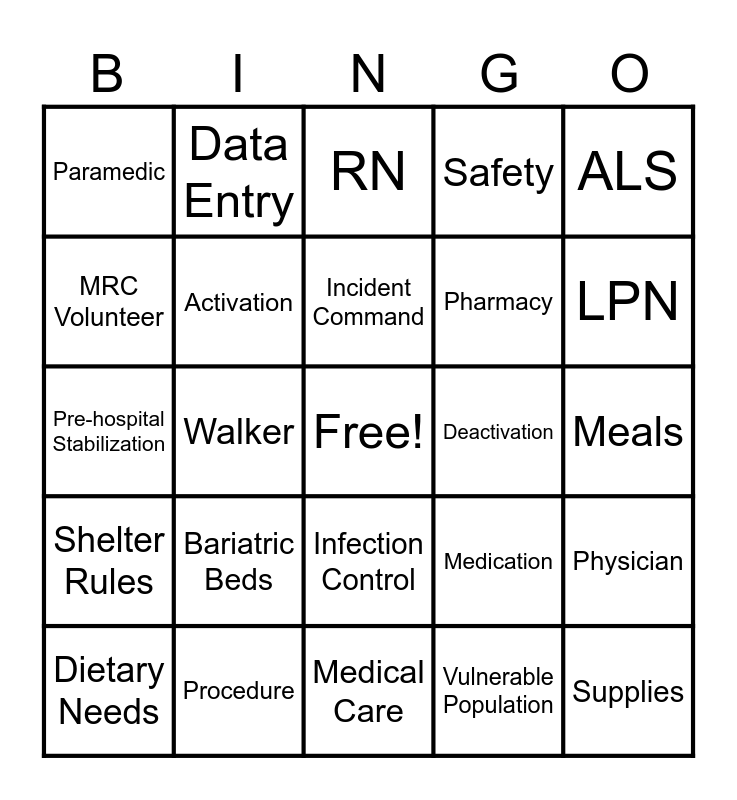 This bingo card has a free space and 25 words: Bariatric Beds, Medical Care, Incident Command, Dietary Needs, ALS, Paramedic, MRC Volunteer, Data Entry, Deactivation, Infection Control, Pharmacy, Pre-hospital Stabilization, Medication, Physician, Activation, EMT, Meals, RN, LPN, Walker, Supplies, Procedure, Shelter Rules, Safety and Vulnerable Population.