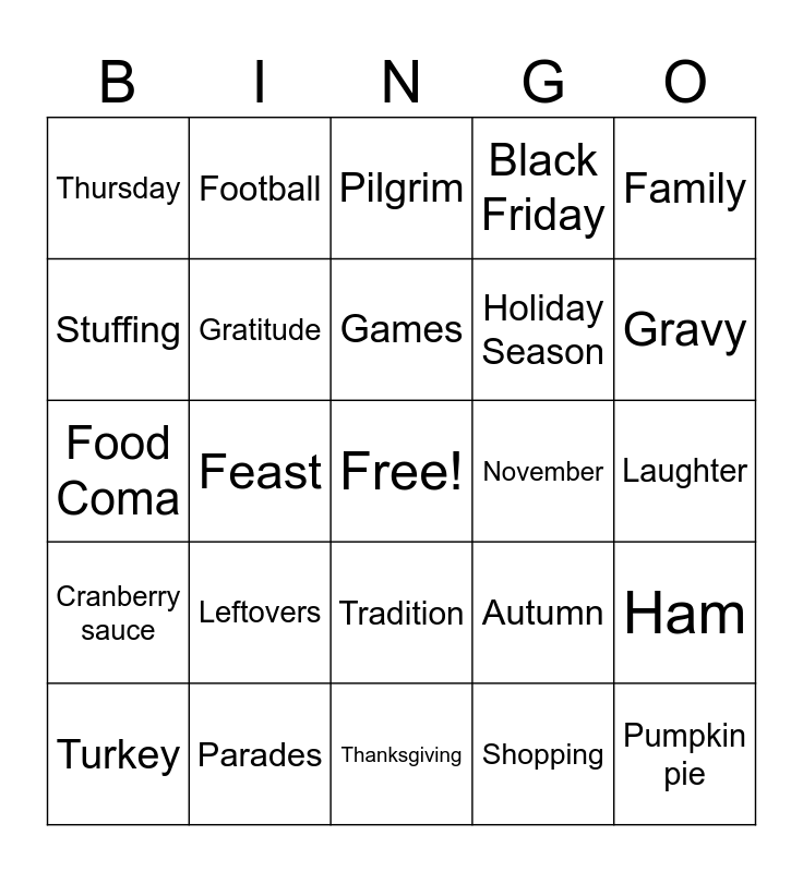 This bingo card has a free space and 24 words: Turkey, Leftovers, Games, Shopping, Family, Thursday, Football, Pilgrim, November, Laughter, Food Coma, Gratitude, Autumn, Ham, Stuffing, Parades, Thanksgiving, Black Friday, Gravy, Cranberry sauce, Feast, Tradition, Holiday Season and Pumpkin pie.