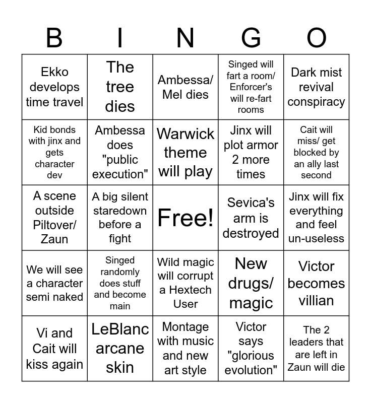 This bingo card has a free space and 24 words: Vi and Cait will kiss again, Singed randomly does stuff and become main, Warwick theme will play, Victor says "glorious evolution", Dark mist revival conspiracy, Ekko develops time travel, The tree dies, Ambessa/ Mel dies, Sevica's arm is destroyed, Jinx will fix everything and feel un-useless, A scene outside Piltover/ Zaun, Ambessa does "public execution", New drugs/ magic, Victor becomes villian, Kid bonds with jinx and gets character dev, LeBlanc arcane skin, Montage with music and new art style, Singed will fart a room/ Enforcer's will re-fart rooms, Cait will miss/ get blocked by an ally last second, We will see a character semi naked, A big silent staredown before a fight, Wild magic will corrupt a Hextech User, Jinx will plot armor 2 more times and The 2 leaders that are left in Zaun will die.