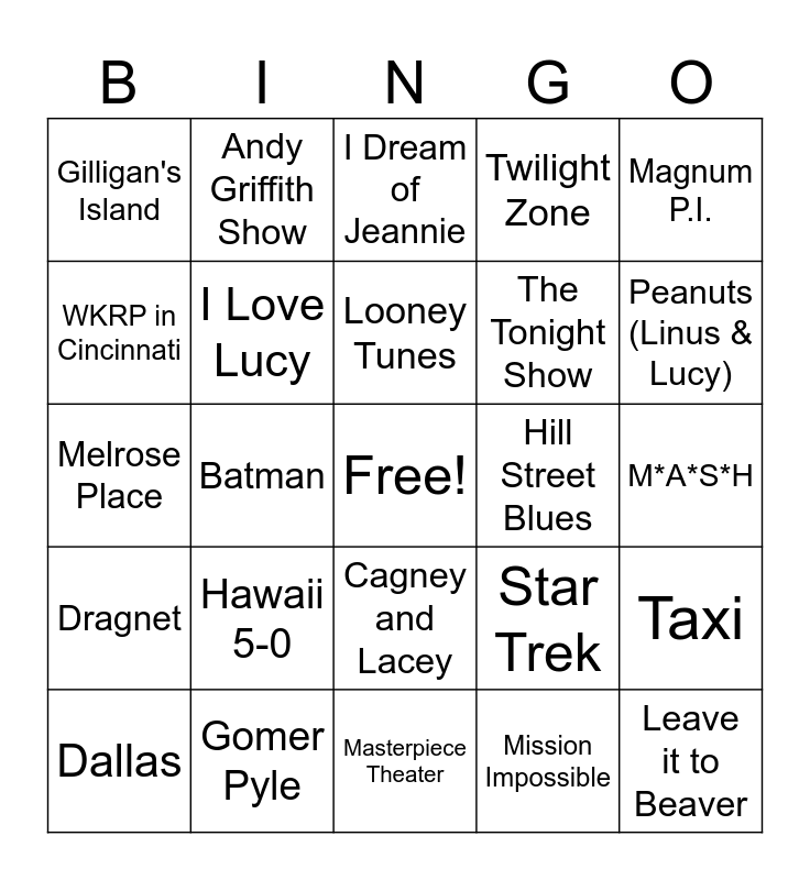 This bingo card has a free space and 29 words: Dallas, Dynasty, Batman, Dennis the Menace, Gilligan's Island, I Dream of Jeannie, I Love Lucy, Hawaii 5-0, Hill Street Blues, Gomer Pyle, M*A*S*H, Leave it to Beaver, Masterpiece Theater, Mission Impossible, Peanuts (Linus & Lucy), Perry Mason, Cagney and Lacey, Dragnet, Magnum P.I., Melrose Place, Star Trek, The Munsters, The Tonight Show, WKRP in Cincinnati, Twilight Zone, Andy Griffith Show, Taxi, Looney Tunes and Bonanza.