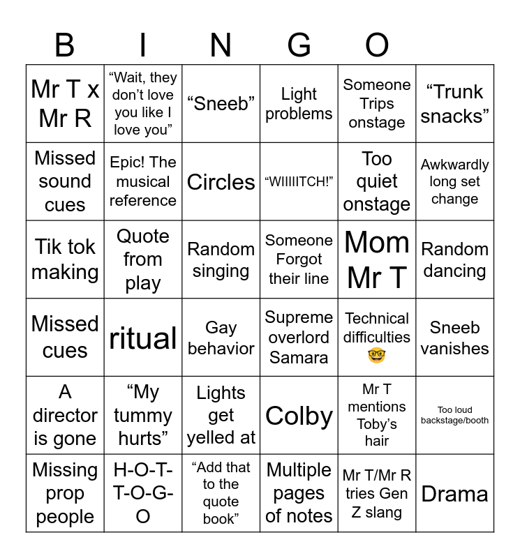 This bingo card has 36 words: Colby, Lights get yelled at, Multiple pages of notes, Missed sound cues, Missed cues, Someone Forgot their line, Epic! The musical reference, “Add that to the quote book”, Someone Trips onstage, Mr T mentions Toby’s hair, Awkwardly long set change, Light problems, Too loud backstage/booth, Quote from play, “WIIIIITCH!”, Mr T x Mr R, A director is gone, Mom Mr T, Tik tok making, “Sneeb”, Random singing, ritual, Supreme overlord Samara, Gay behavior, Technical difficulties 🤓, “Wait, they don’t love you like I love you”, Too quiet onstage, H-O-T-T-O-G-O, Circles, “Trunk snacks”, Drama, Missing prop people, Sneeb vanishes, Random dancing, “My tummy hurts” and Mr T/Mr R tries Gen Z slang.