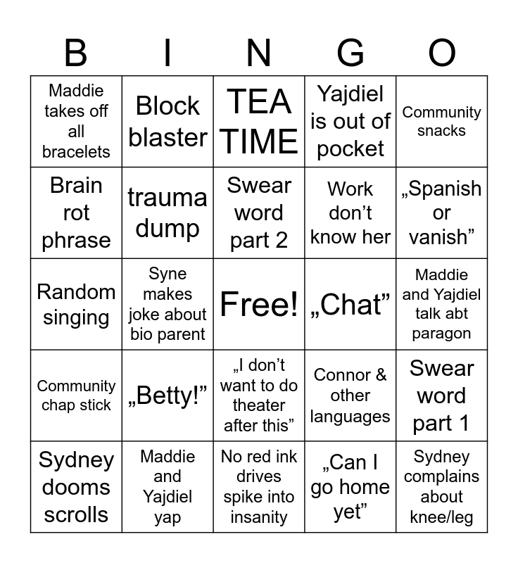 This bingo card has a free space and 29 words: Sydney dooms scrolls, Connor/yajdiel is the only one who gets the work done, Syne makes joke about bio parent, Spike makes a dead mom joke, Maddie takes off all bracelets, TEA TIME, trauma dump, „Betty!”, „Chat”, Maddie and Yajdiel yap, Maddie and Yajdiel talk abt paragon, Sydney complains about knee/leg, No red ink drives spike into insanity, „Can I go home yet”, „Spanish or vanish”, „Why did I join this class again?”, „I don’t want to do theater after this”, Community chap stick, Community snacks, Random singing, Connor & other languages, Community water bottle, Work don’t know her, Brain rot phrase, Yajdiel is out of pocket, Block blaster, Swear word part 1, Swear word part 2 and „I’ll do this at home” (no you won’t Sydney).