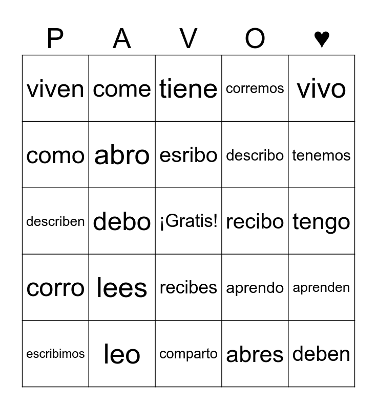 This bingo card has a free space and 24 words: lees, leo, esribo, escribimos, vivo, viven, como, come, recibo, recibes, describo, describen, aprendo, aprenden, abro, abres, tengo, tiene, tenemos, debo, deben, corro, corremos and comparto.