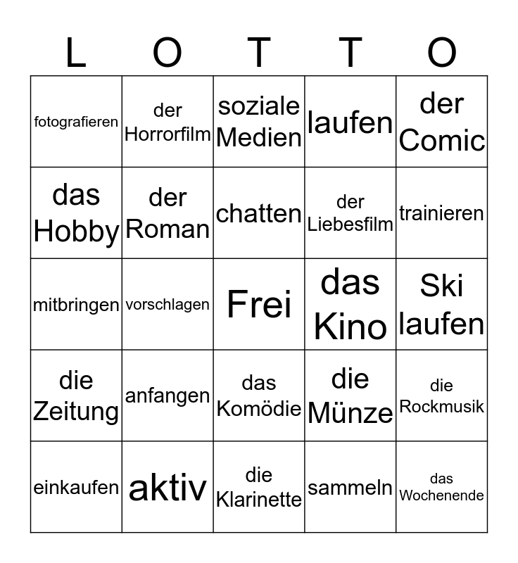 This bingo card has a free space and 24 words: anfangen, aktiv, chatten, einkaufen, der Comic, fotografieren, das Hobby, der Horrorfilm, das Kino, das Komödie, der Liebesfilm, mitbringen, die Münze, die Rockmusik, der Roman, sammeln, Ski laufen, soziale Medien, trainieren, vorschlagen, das Wochenende, die Zeitung, laufen and die Klarinette.