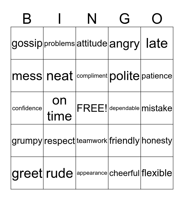 This bingo card has a free space and 24 words: respect, rude, compliment, greet, late, gossip, mess, problems, dependable, teamwork, polite, confidence, friendly, honesty, neat, cheerful, mistake, attitude, patience, on time, flexible, grumpy, angry and appearance.