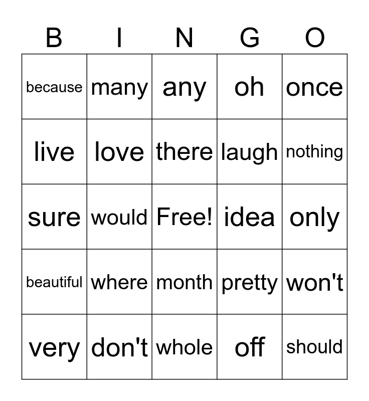 This bingo card has a free space and 27 words: pretty, whose, laugh, whole, live, any, many, beautiful, idea, won't, sure, oh, very, don't, nothing, saw, love, there, where, because, only, off, would, should, month, once and done.