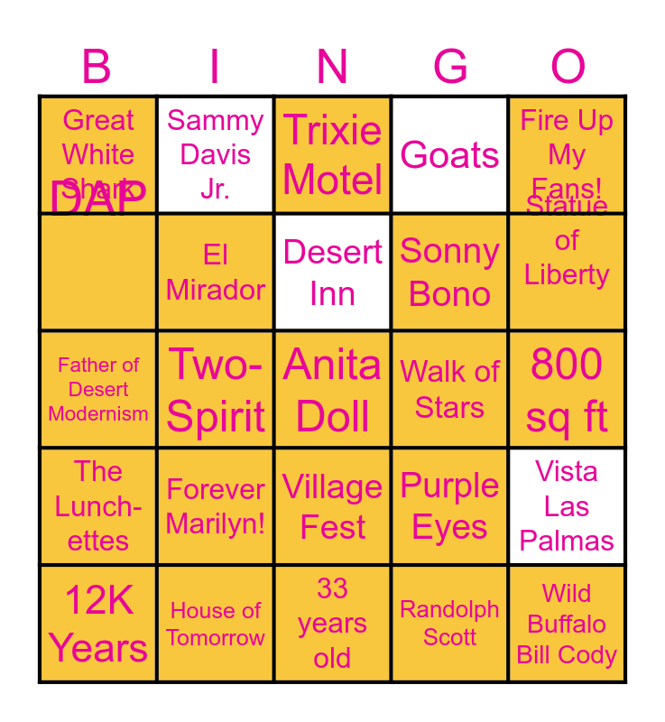 This bingo card has a free space and 29 words: 12K Years, Date Shake, Two-Spirit, Kenny Irwin Jr., Great White Shark, Trixie Motel, El Mirador, Forever Marilyn!, Walk of Stars, House of Tomorrow, 800 sq ft, Wild Buffalo Bill Cody, 33 years old, Randolph Scott, Statue of Liberty, Master of Steel, Village Fest, The Lunch-ettes, Fire Up My Fans!, Father of Desert Modernism, Purple Eyes, Titanic, Sonny Bono, DAP, Goats, Sammy Davis Jr., Vista Las Palmas, Desert Inn and I love myself!.