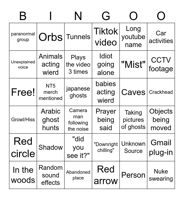 This bingo card has 36 words: "Downright chilling", "did you see it?", Red arrow, Unexplained voice, Growl/Hiss, babies acting wierd, Animals acting wierd, Abandoned place, Long youtube name, Unknown Source, CCTV footage, Tiktok video, Gmail plug-in, NT5 merch mentioned, Idiot going alone, paranormal group, Red circle, Caves, Free!, Tunnels, japanese ghosts, Arabic ghost hunts, Prayer being said, Camera man following the noise, Taking pictures of ghosts, Orbs, "Mist", Random sound effects, Plays the video 3 times, Car activities, Nuke swearing, In the woods, Objects being moved, Crackhead, Shadow and Person.