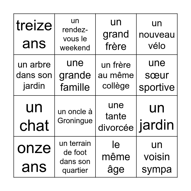 This bingo card has 20 words: un jardin, un chien, un grand frère, une petite sœur, onze ans, un arbre dans son jardin, un terrain de foot dans son quartier, treize ans, un chat, un rendez-vous le weekend, un oncle à Groningue, une tante divorcée, une grande famille, un voisin sympa, un frère au même collège, un petit jardin, une sœur sportive, un nouveau vélo, le même âge and des grands-parents tout près.